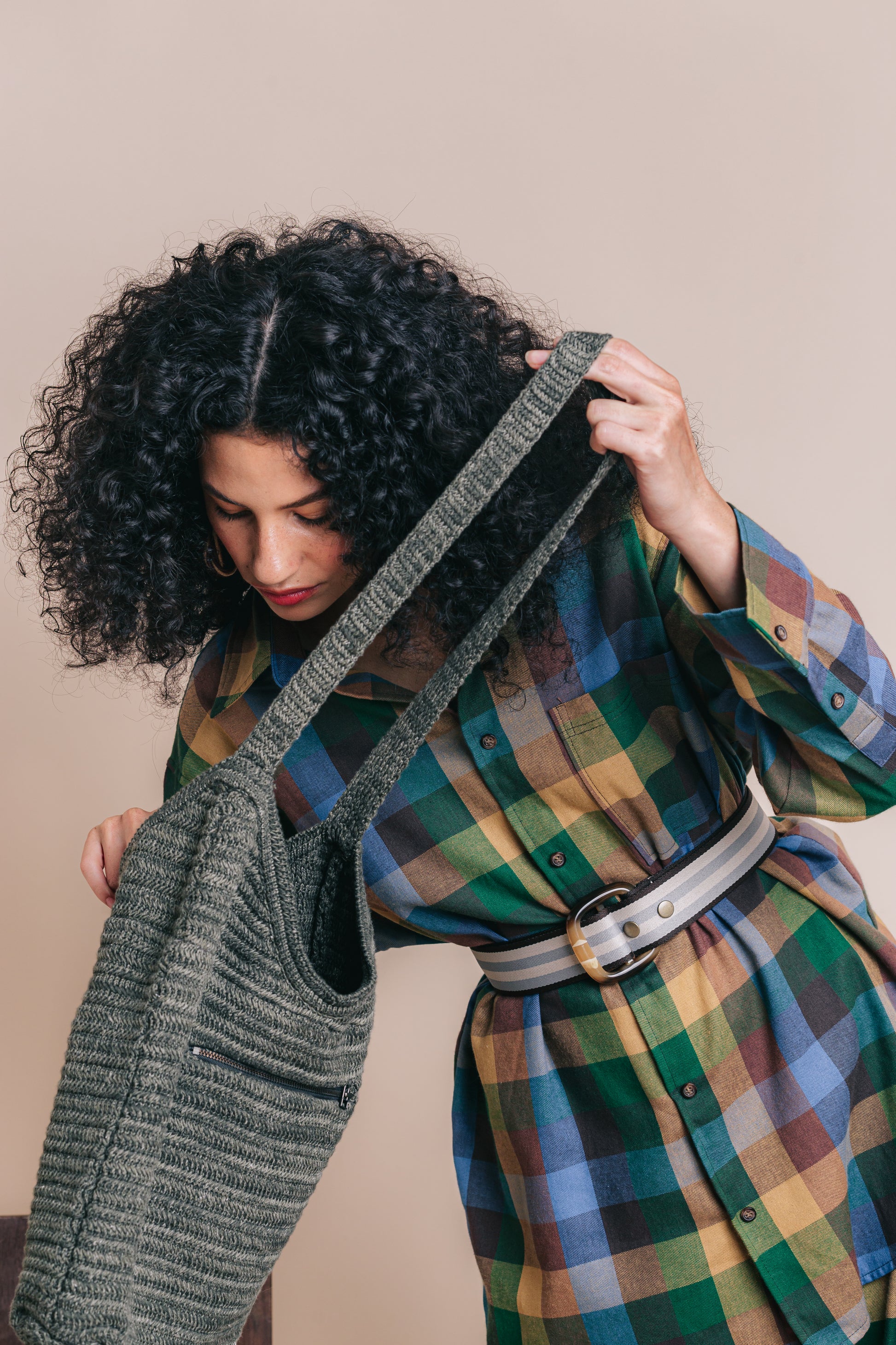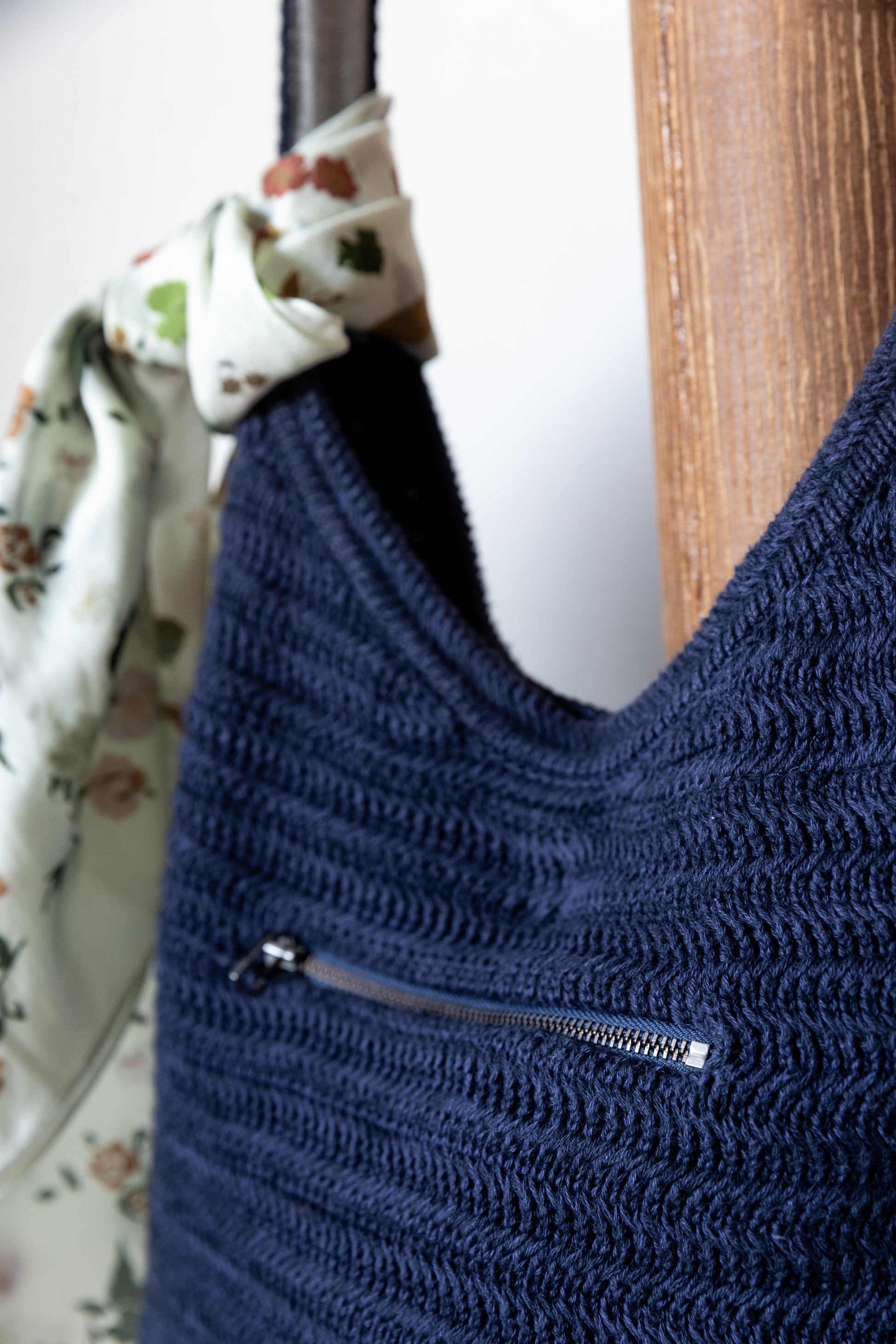 A exclusiva Bolsa Lee tricotada, com design moderno em ziguezague, oferece estilo e praticidade. Feita com zíper de metal, forro em algodão e fechamento em botão de pressão com pedra azul, é a escolha perfeita para compor looks incríveis.