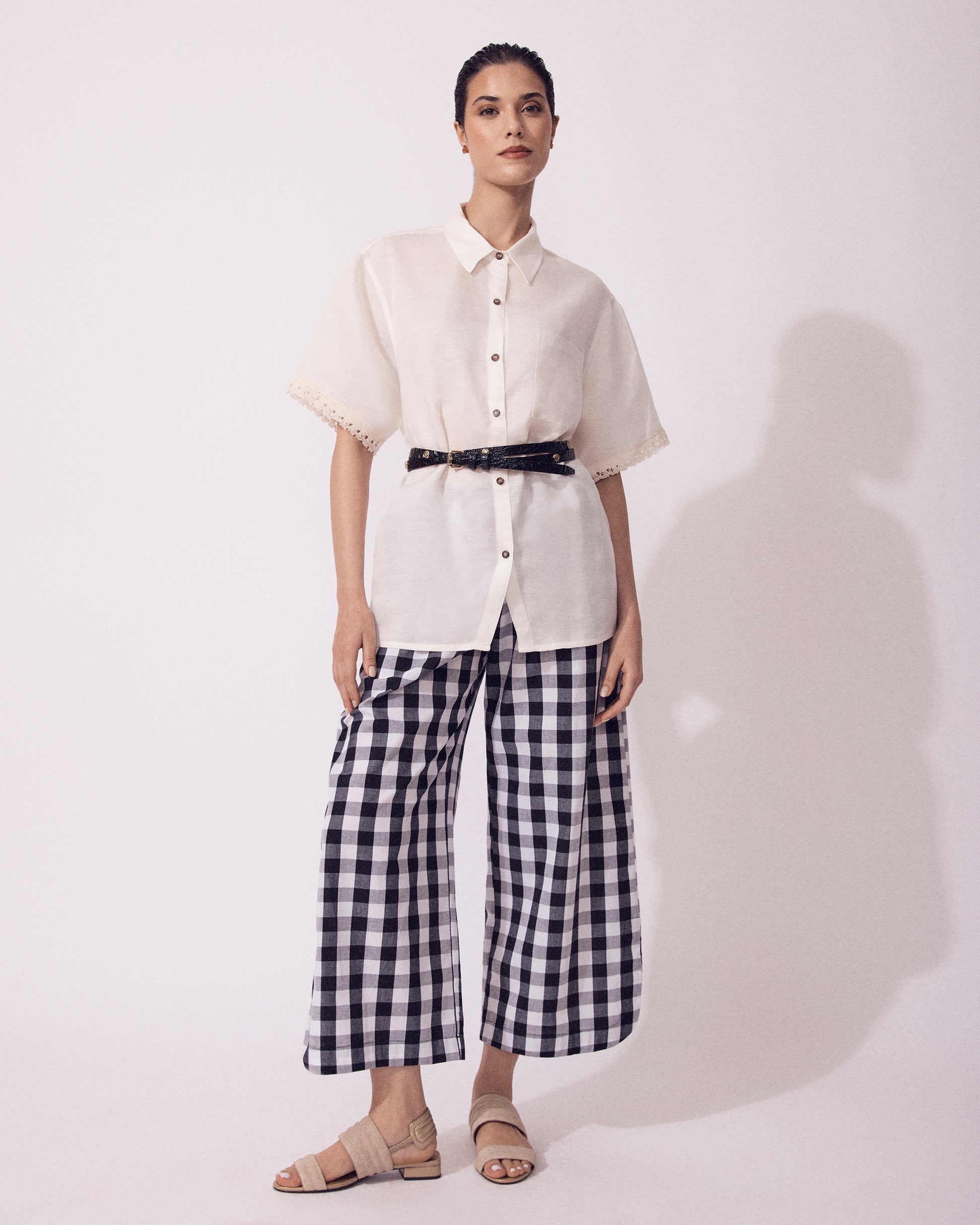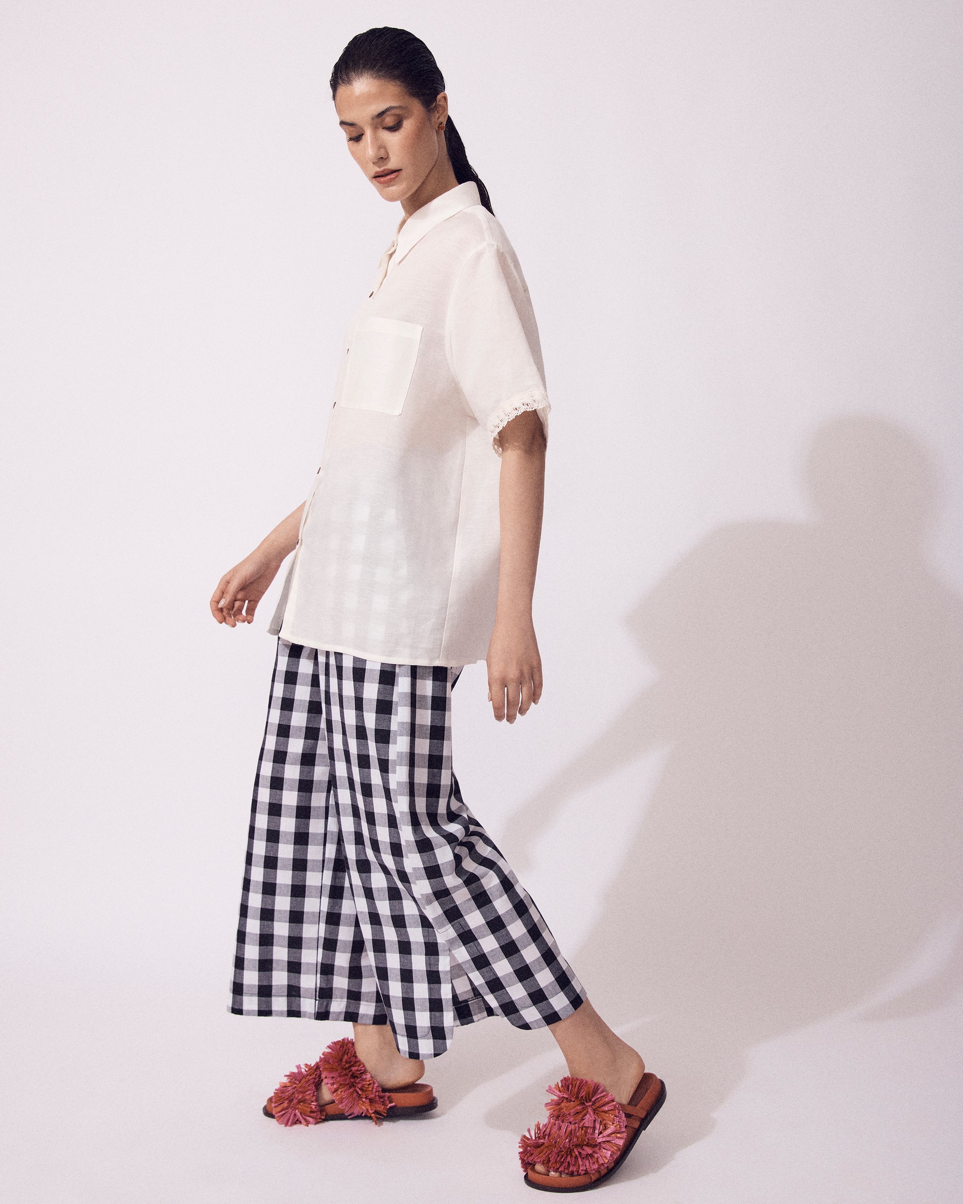 A Calça Elba é confeccionada em tecido xadrez preto e branco de algodão. Possui modelagem reta e comprimento pantacourt, com cós de elástico, bolsos e fenda lateral na barra. É uma peça confortável, ideal para compor looks leves e modernos.