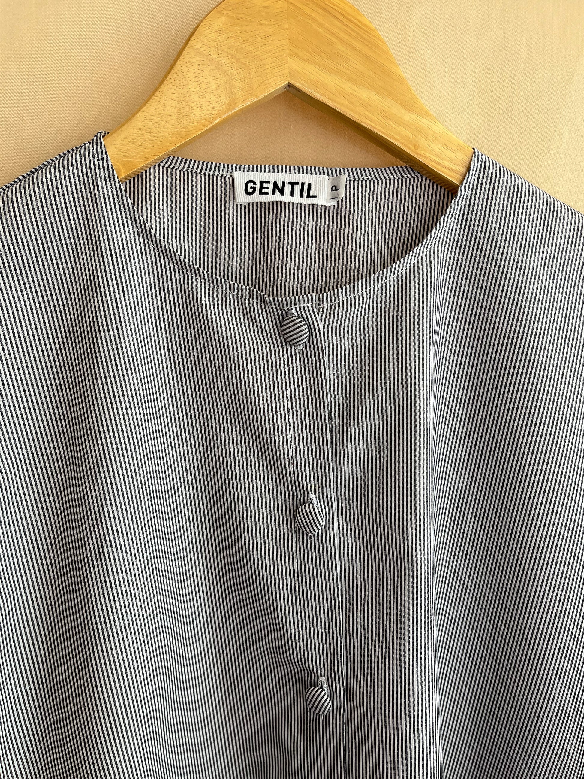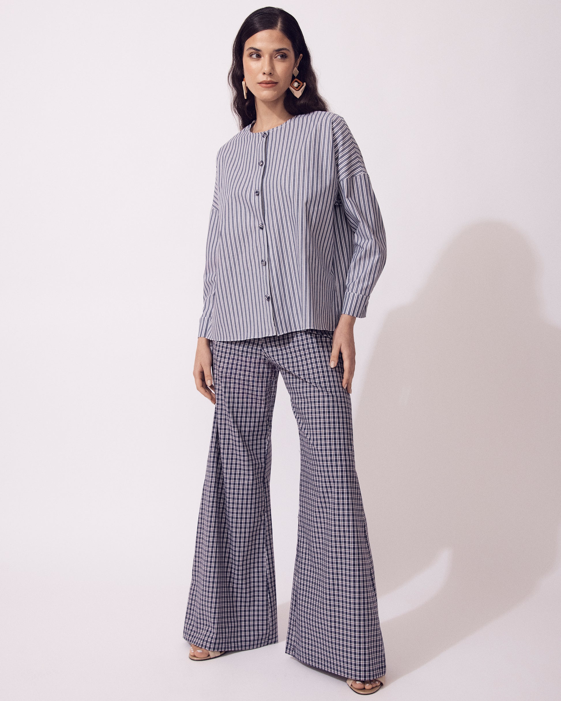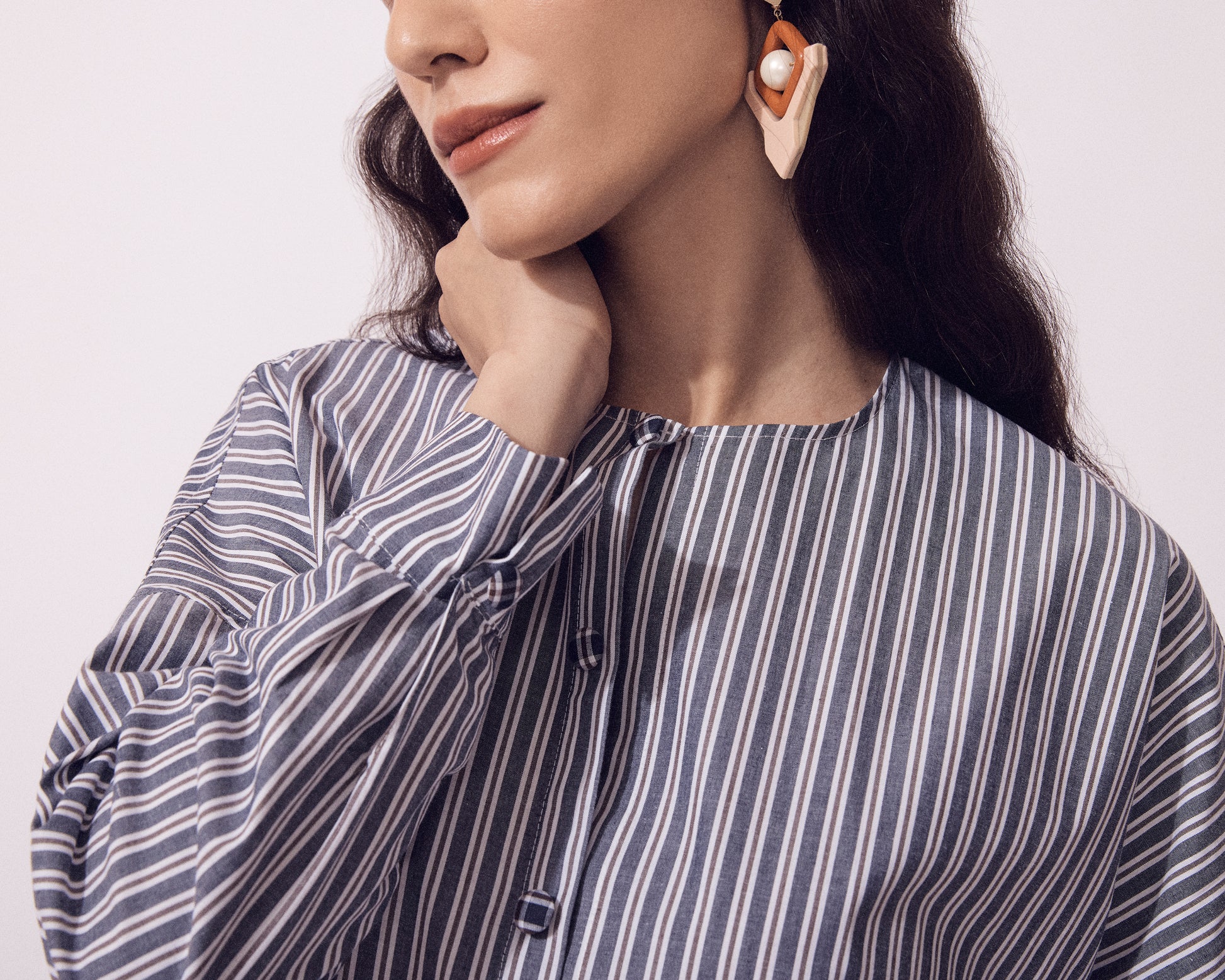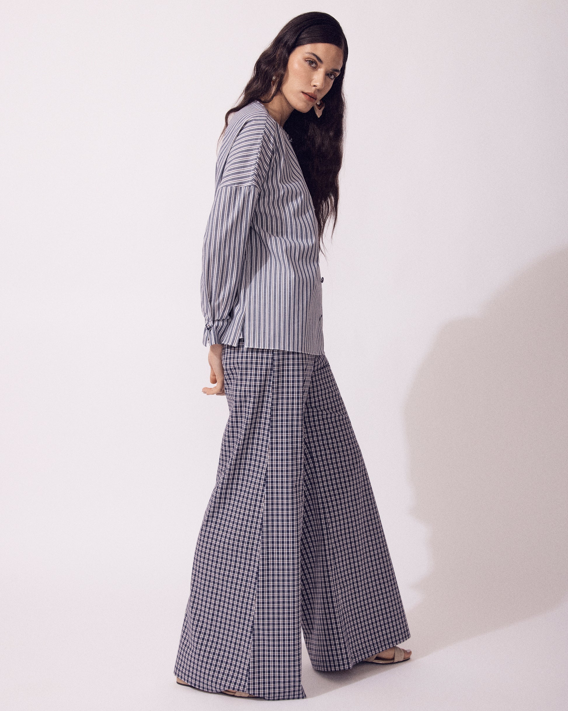 A Camisa Lucca é feita em tecido de algodão listrado, disponível em três versões. Possui modelagem ampla, barra reta com fendas laterais e botões forrados no mesmo tecido ou em tecido xadrez no mesmo tom, que adicionam um charme especial à peça.