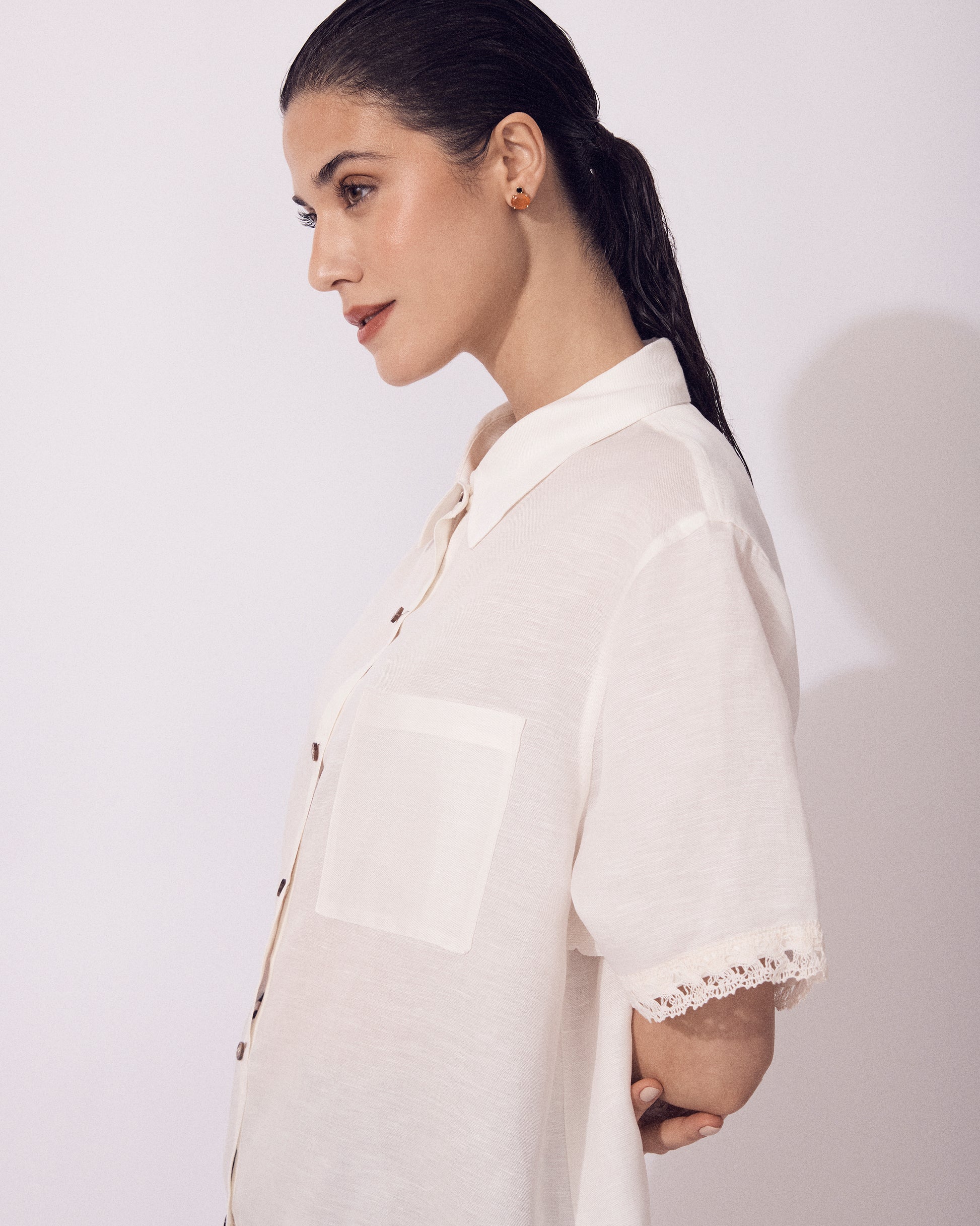 A Camisa Mariucha é confeccionada em uma combinação de tecido modal com linho, na cor off-white. Com modelagem reta, apresenta recorte nas costas, gola clássica e um bolso frontal funcional. O destaque da peça é o delicado detalhe em renda guipir nas mangas, que adiciona um toque de sofisticação e feminilidade à camisa.