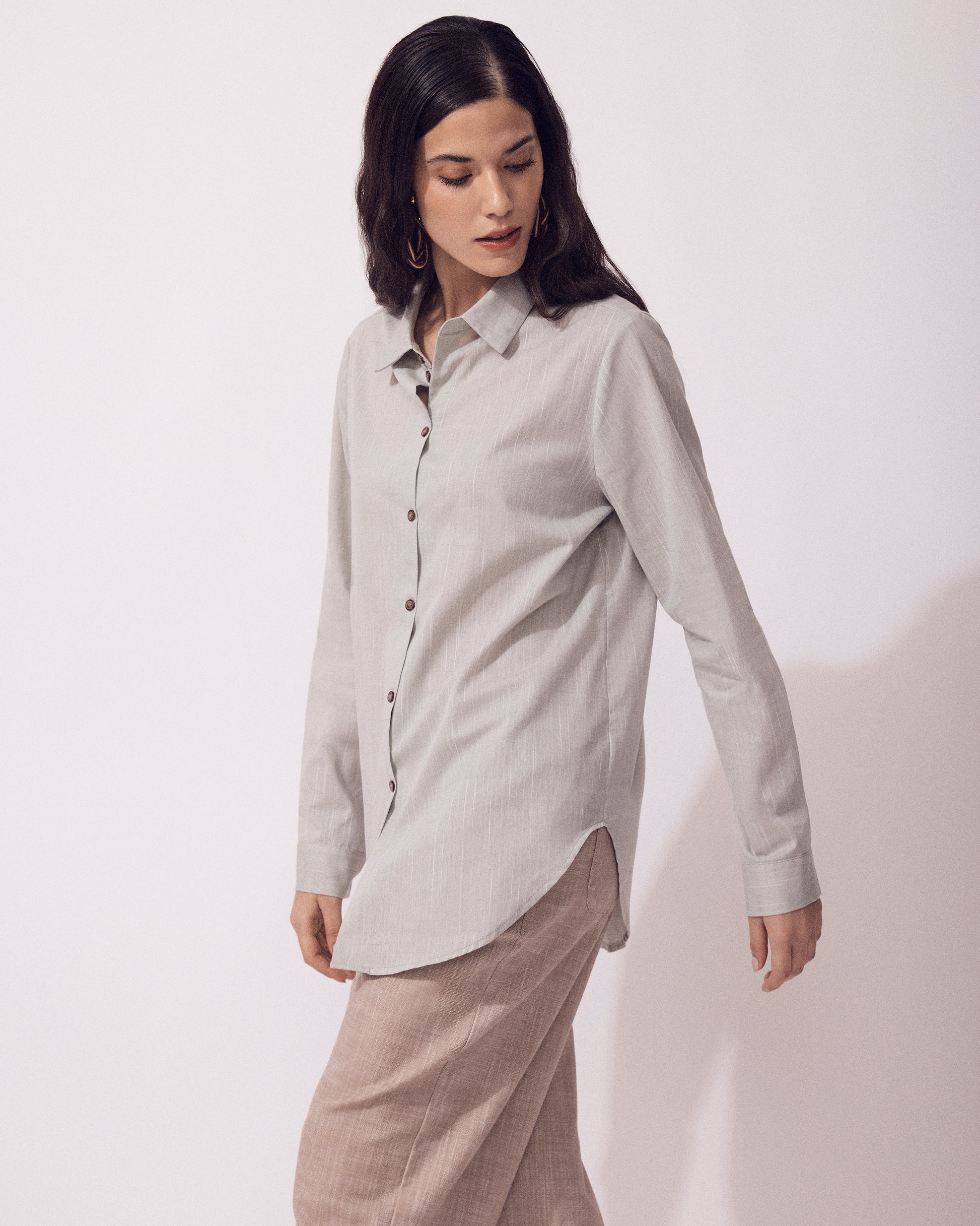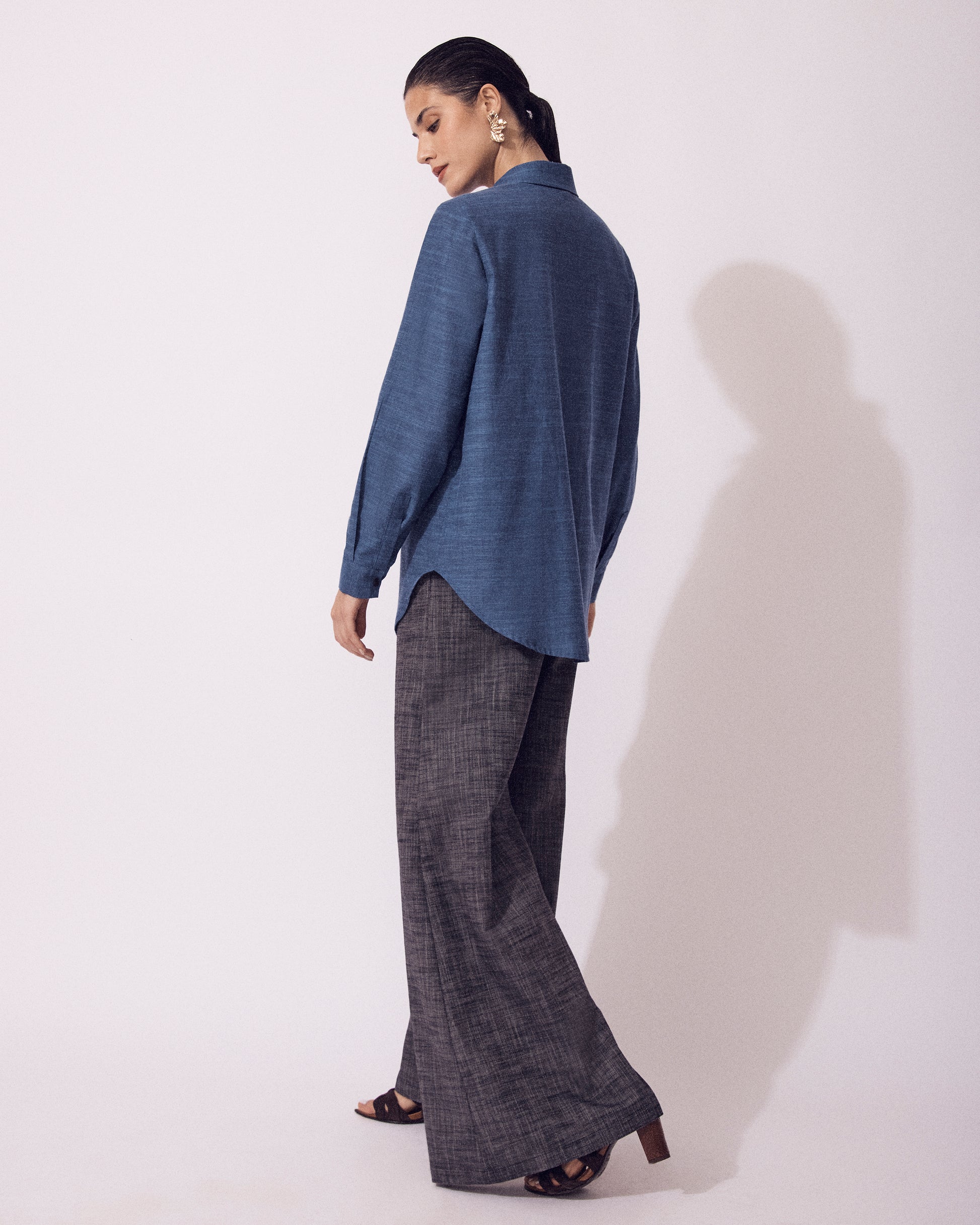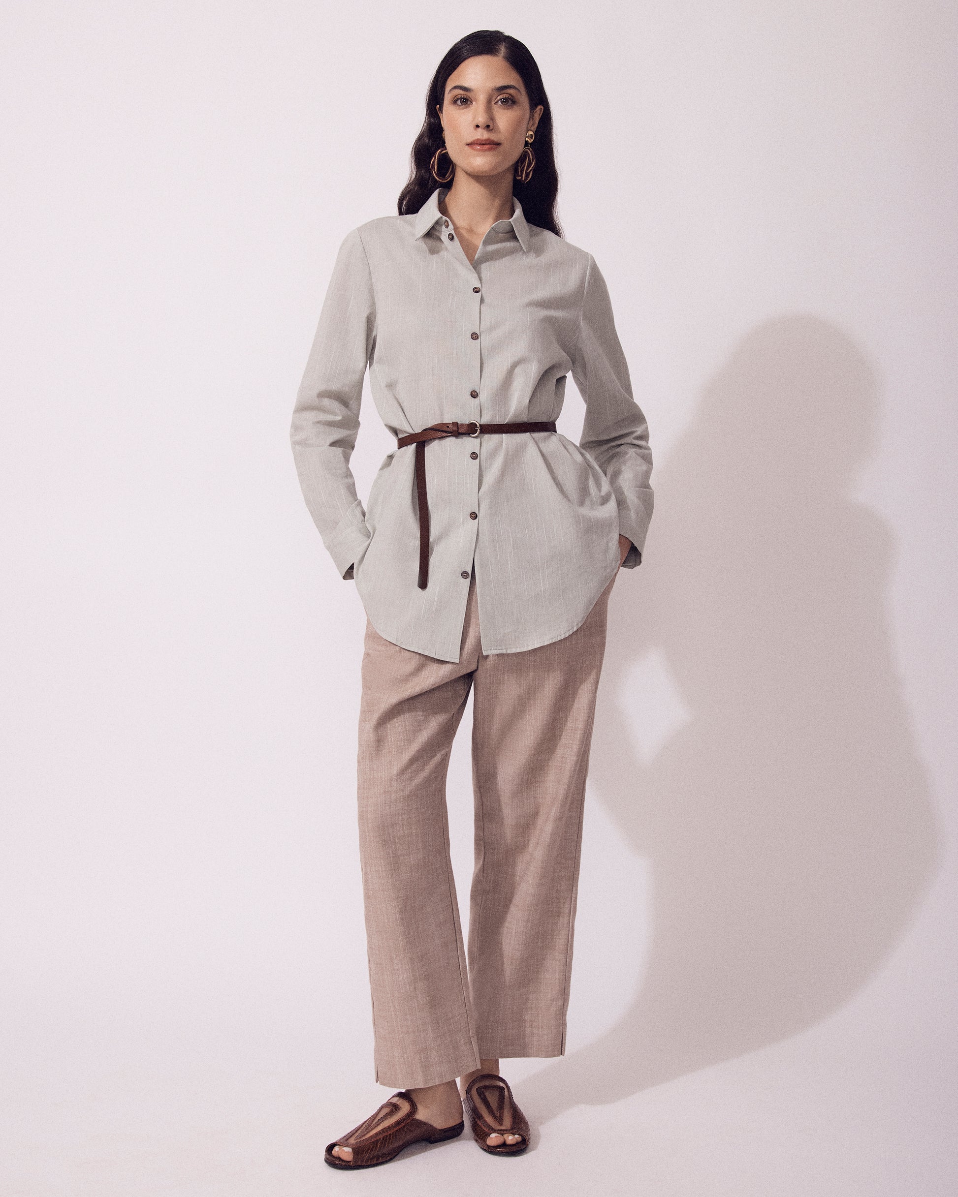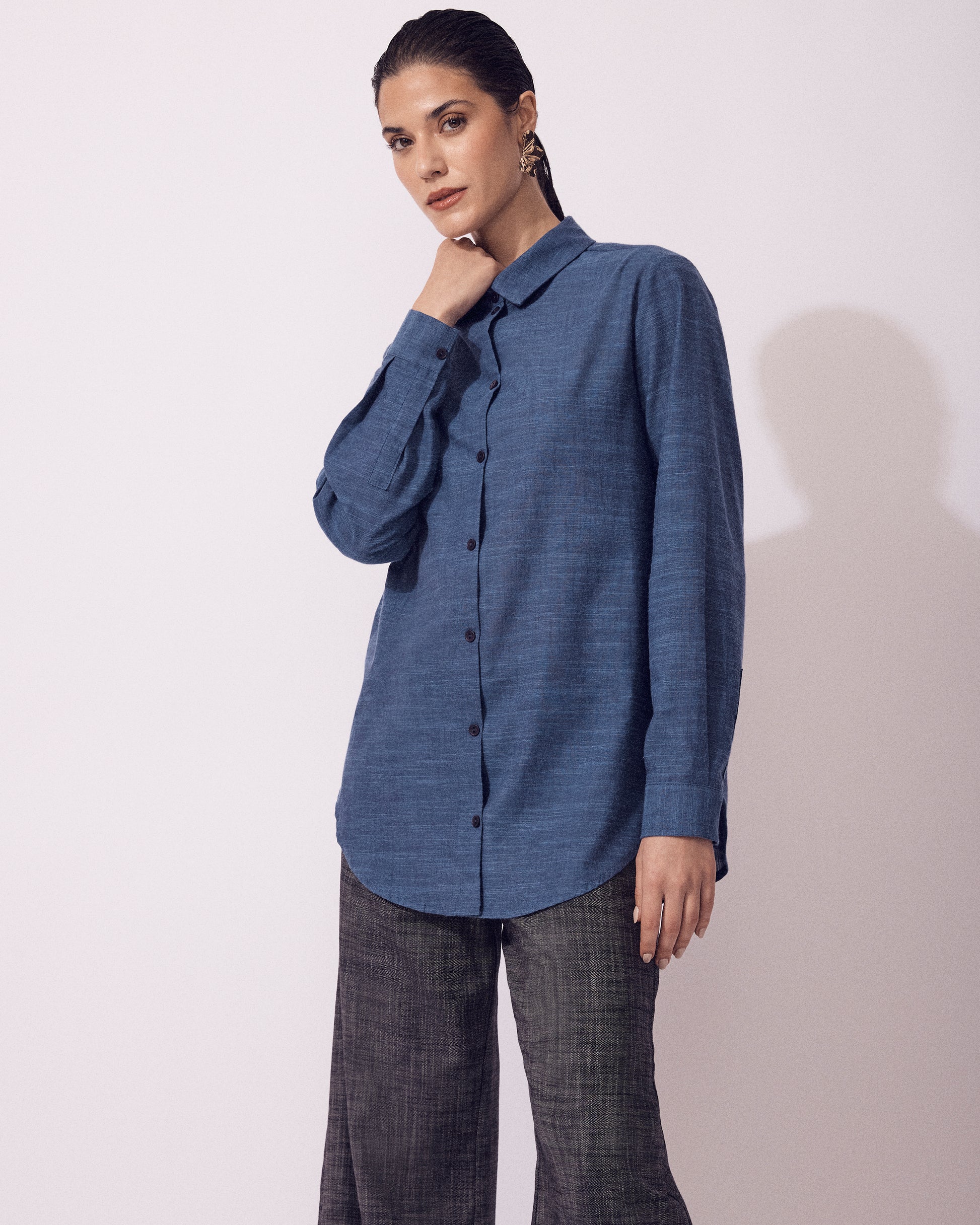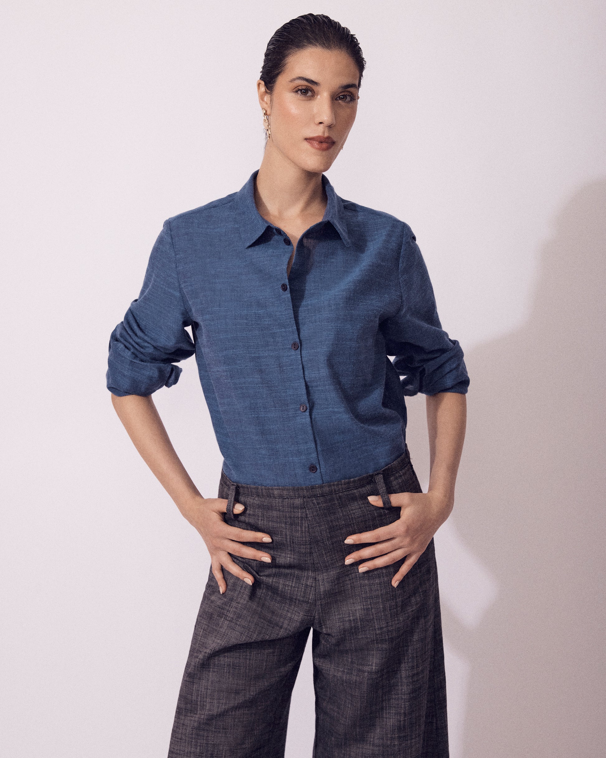 A Camisa Pisa é confeccionada em tecido de algodão, disponível nas cores marinho e verde claro. Com modelagem reta, comprimento alongado e barra arredondada, é uma peça clássica e versátil, que pode ser usada em ocasiões formais ou casuais.