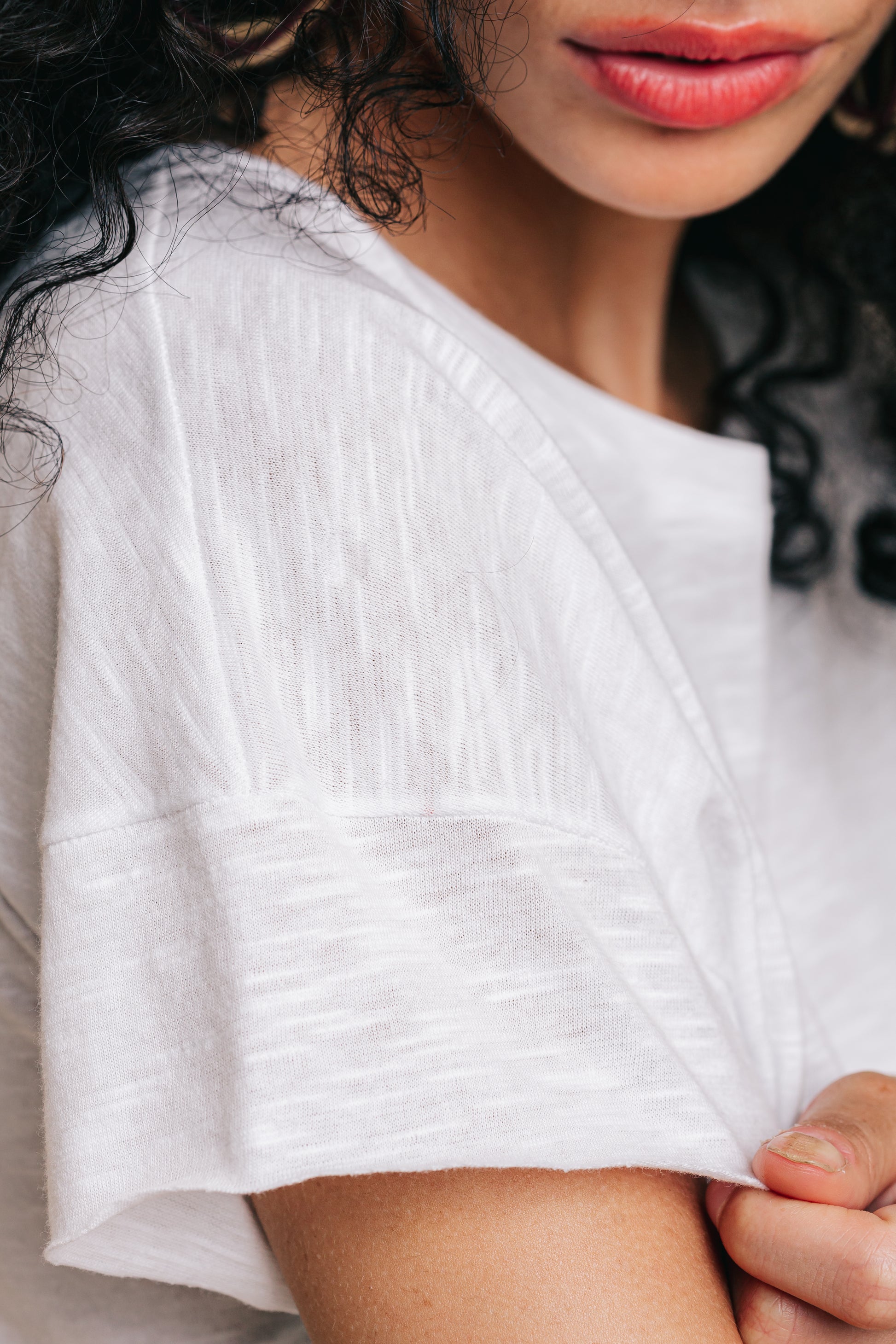 A Camiseta Paula, com cavas fora do lugar e manga curta com acabamento a fio, oferece um design solto e confortável. Fácil de usar, essa peça se adapta a diversos looks e é ideal para quem busca praticidade no dia a dia.