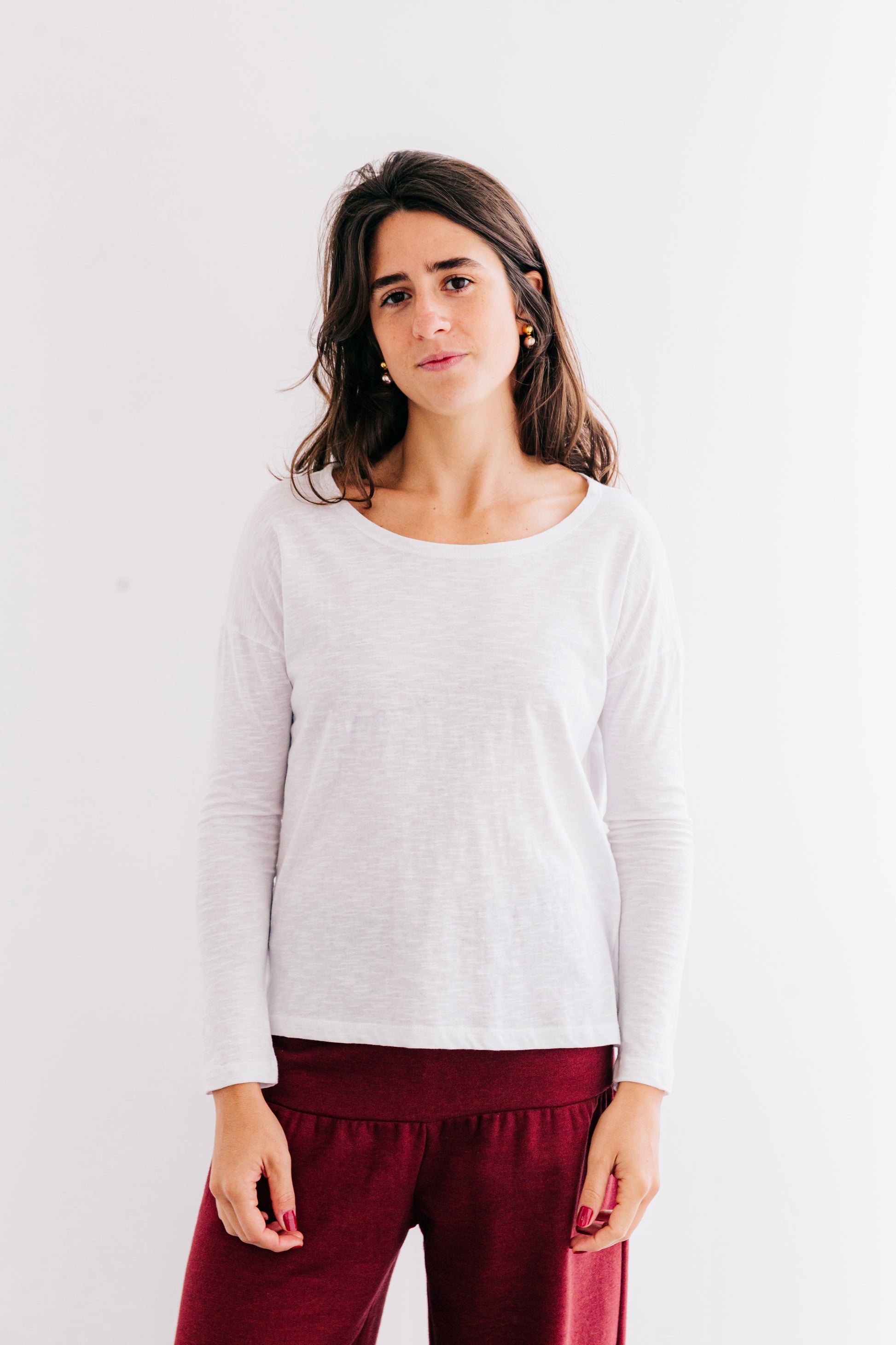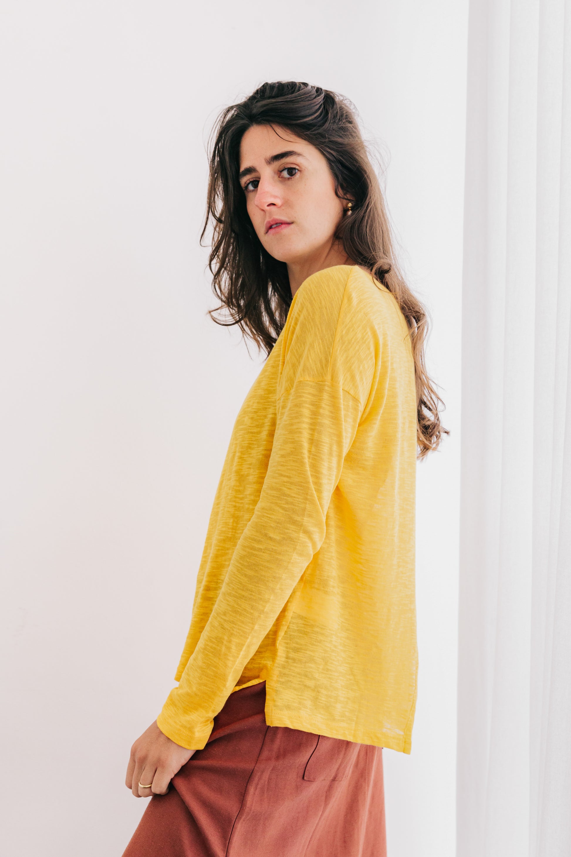 Produzida em malha de algodão suave, a Camiseta Yara apresenta uma costura distintiva no centro das costas, culminando em uma abertura sutil que acrescenta um detalhe único à peça. Com mangas longas, essa camiseta é perfeita para combinações casuais, oferecendo um visual atraente sem esforço.
