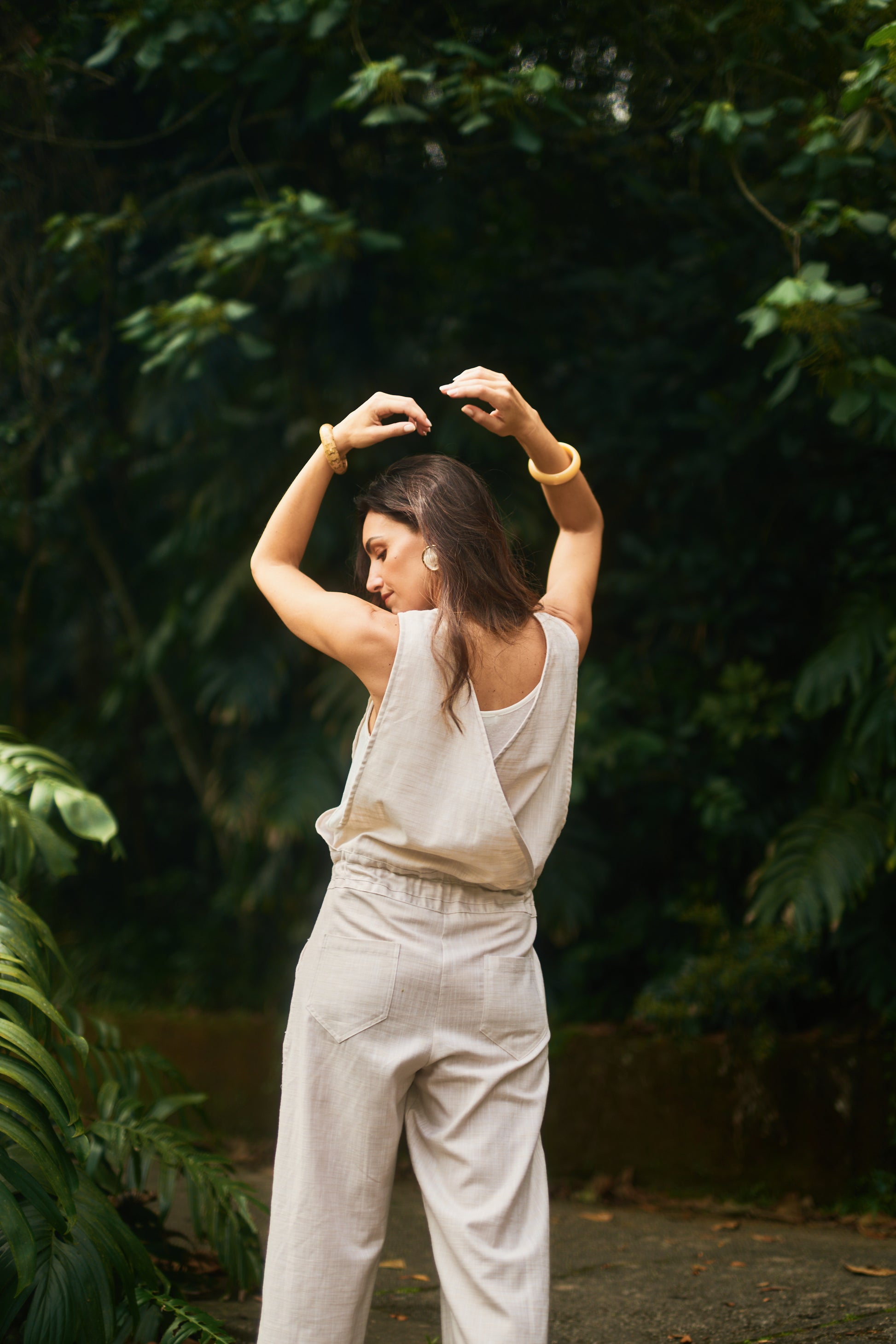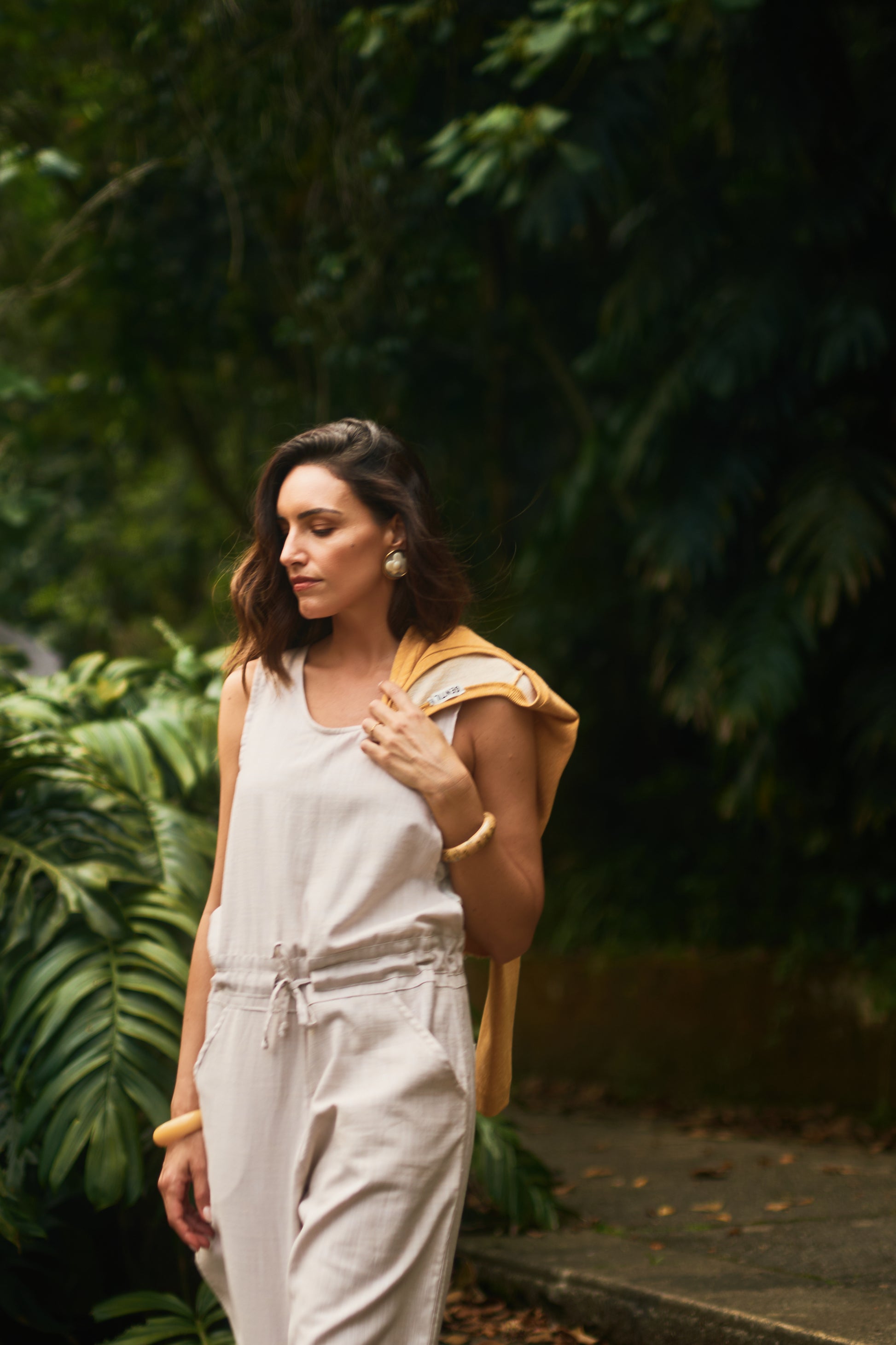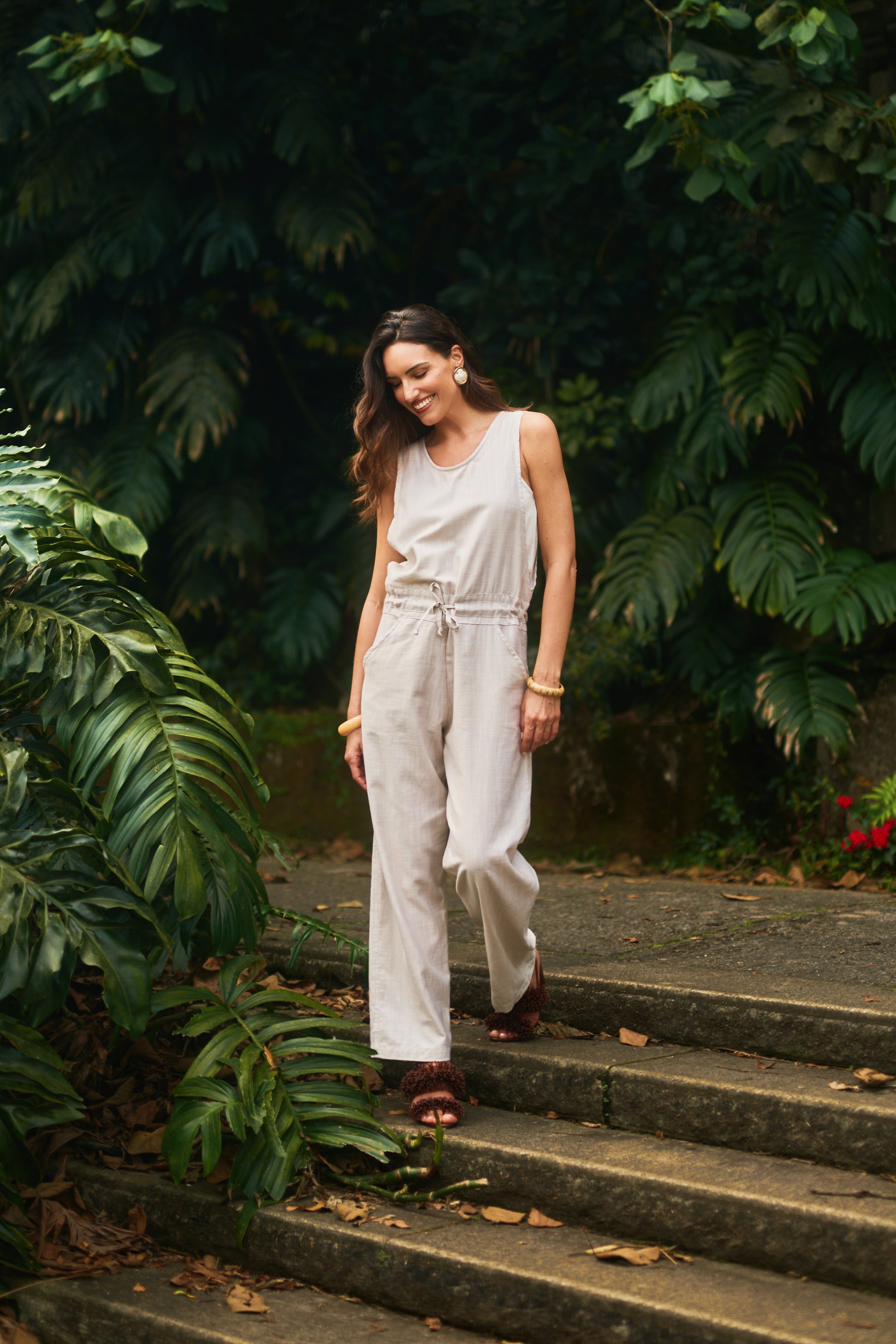 O Macacão Fiori possui modelagem soltinha e é confeccionado em tecido leve de algodão. Possui decote arredondado, cavas profundas e um transpasse nas costas. A calça de corte reto conta com cordão no mesmo tecido e bolsos laterais e traseiros. Uma peça que une estilo e conforto.