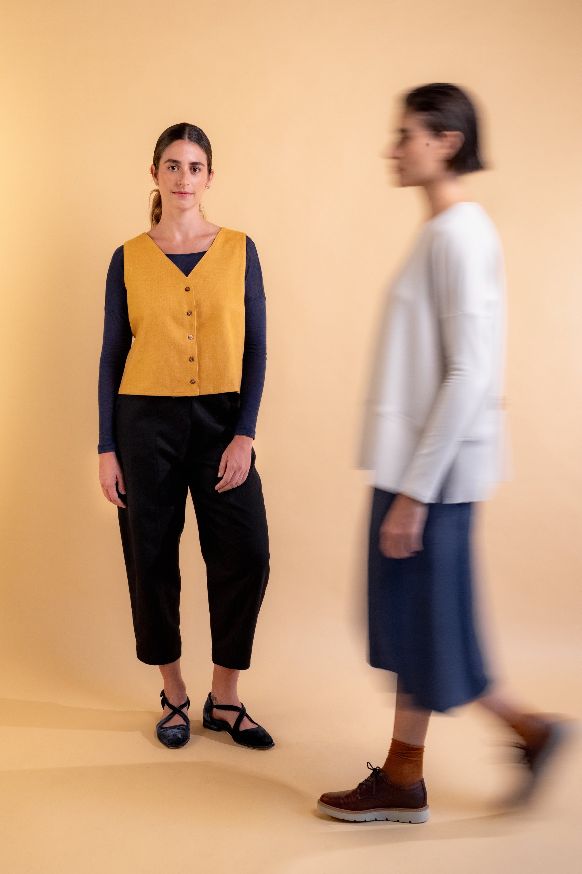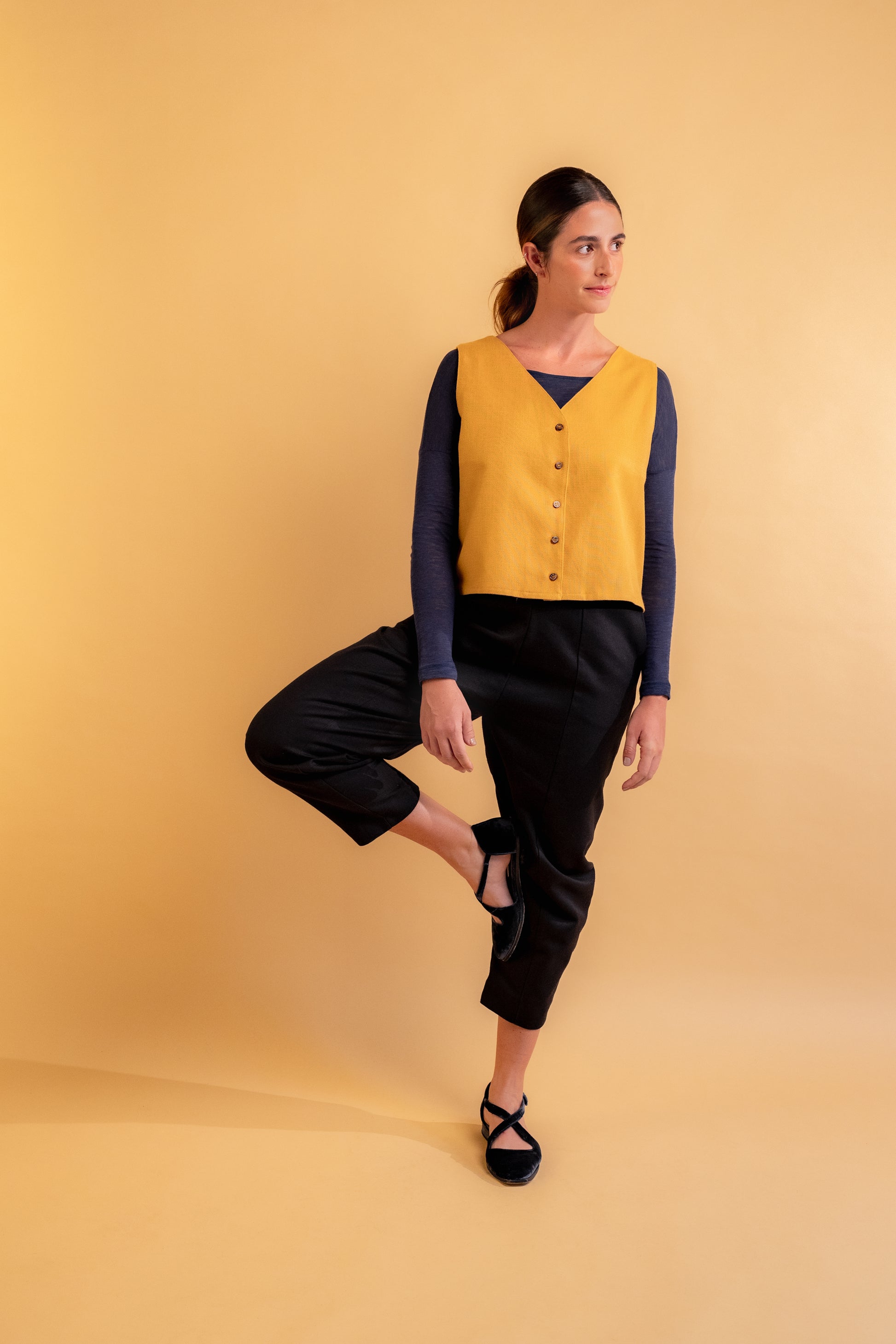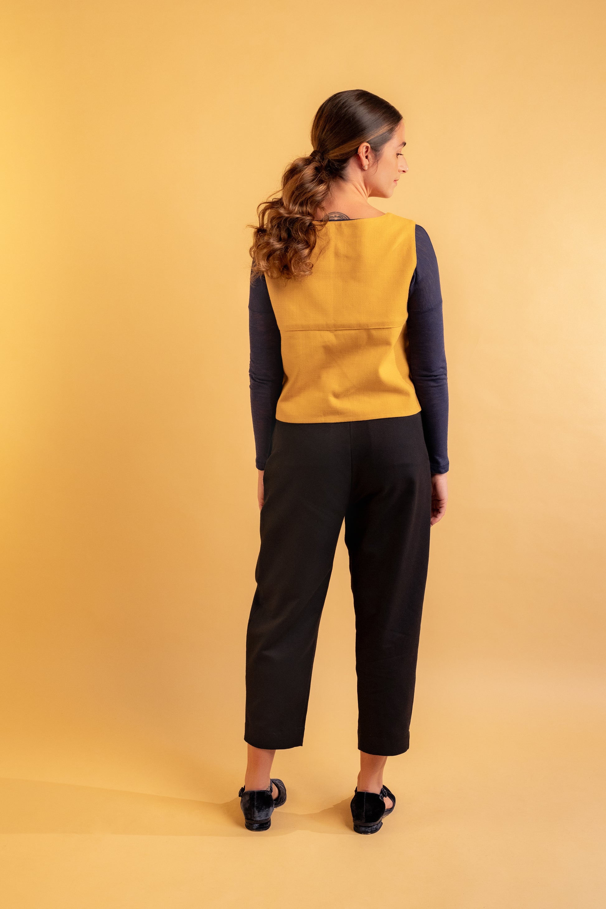A Blusa Clara redefine a moda moderna com um design que harmoniza conforto e estilo. Caracterizada por seu abotoamento frontal e ausência de mangas, essa peça se destaca por sua modelagem solta e comprimento mais curto, projetada para um visual contemporâneo e sofisticado. Com acabamento duplo, cada detalhe é cuidadosamente pensado para realçar a beleza da blusa. Disponível em duas composições específicas, cada uma traz sua essência: a versão em preto é confeccionada em 100% algodão para quem busca simplicidade e conforto, enquanto a opção em açafrão, uma mistura de algodão, viscose e linho, oferece uma textura única e um caimento leve.