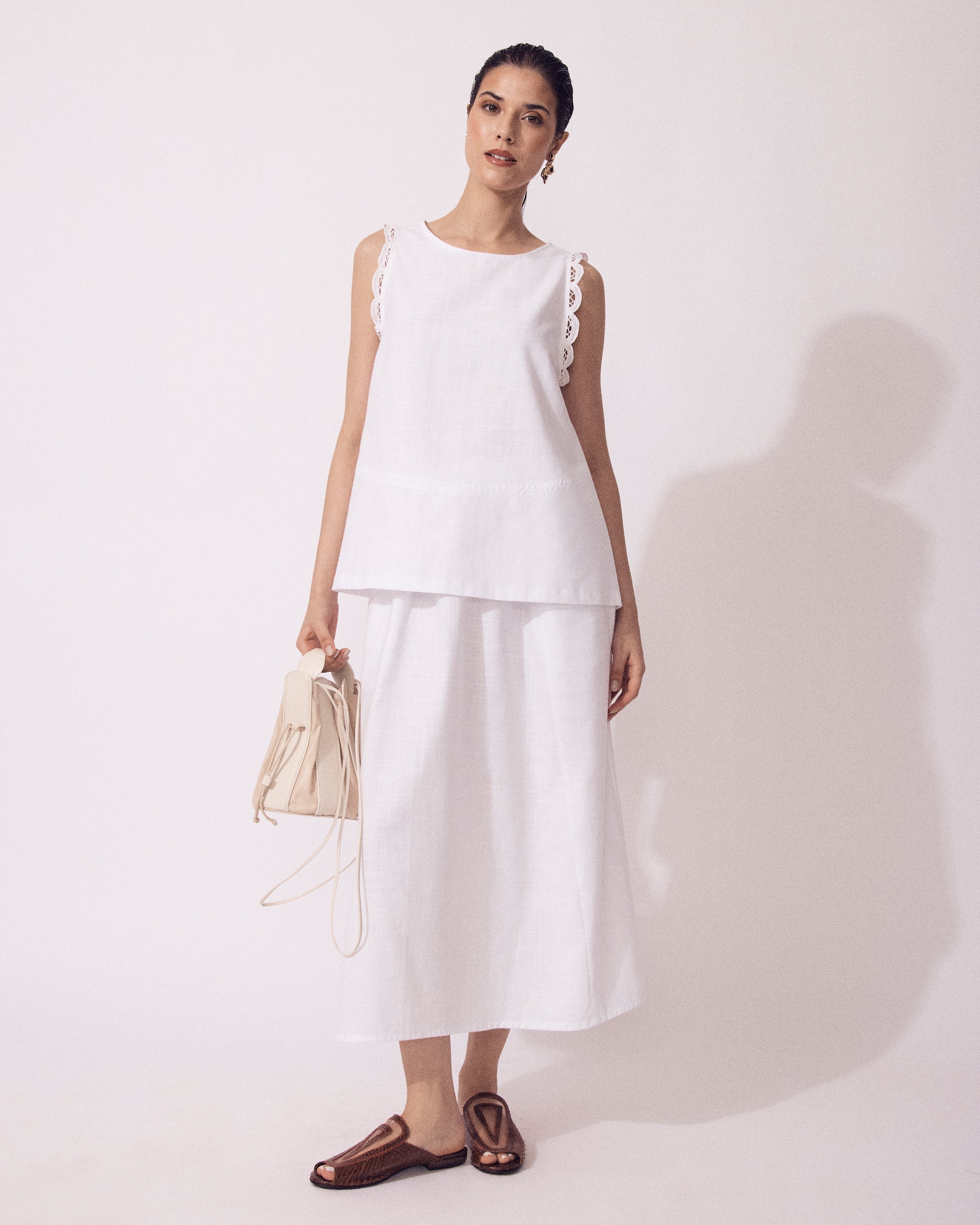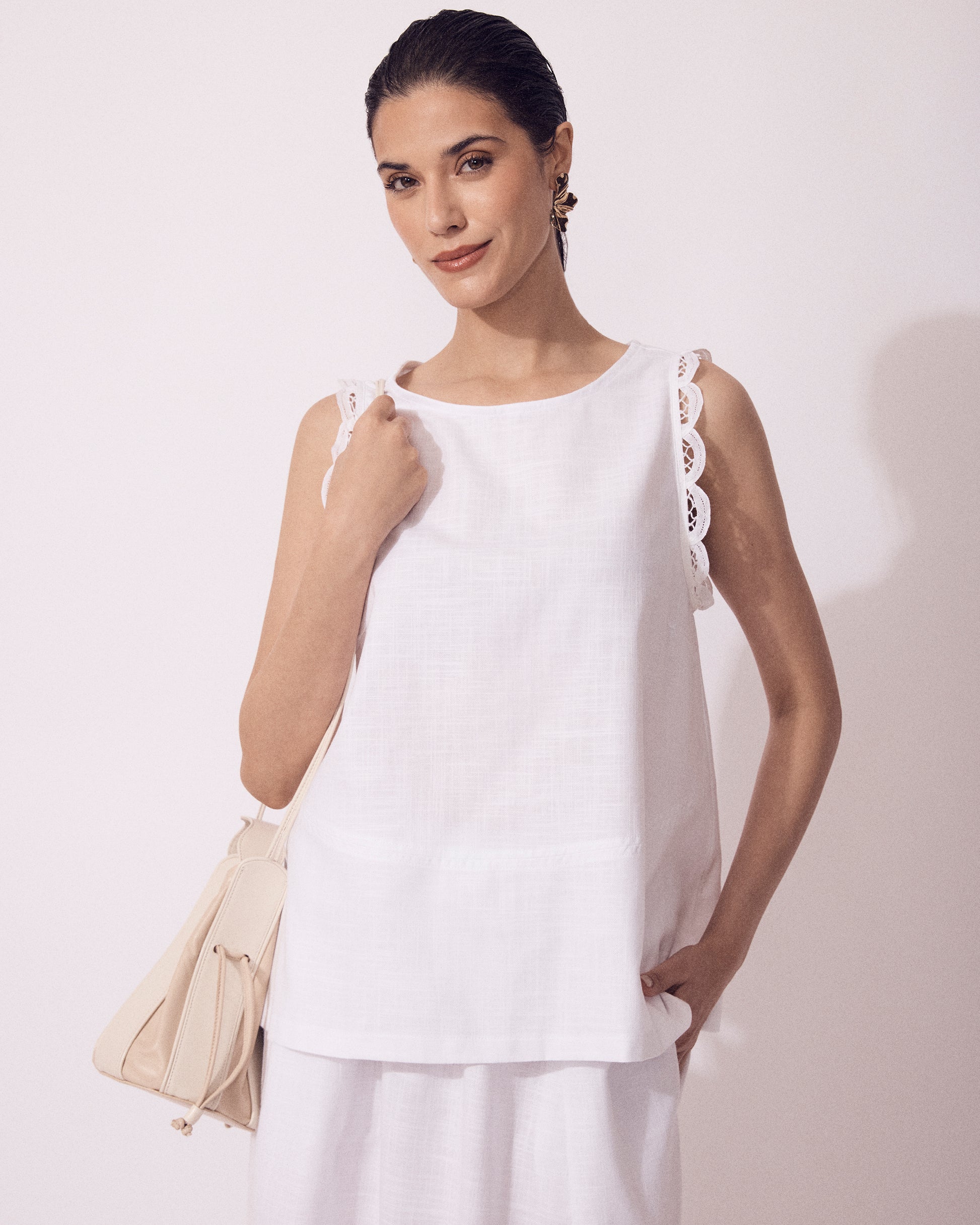 A Regata Lorenzo possui modelagem solta e evasê. O destaque fica por conta da renda guipir aplicada nas cavas, um detalhe delicado que deixa a peça ainda mais charmosa. Leve e estilosa, é a escolha perfeita para os dias quentes de verão, adaptando-se a diversas ocasiões.