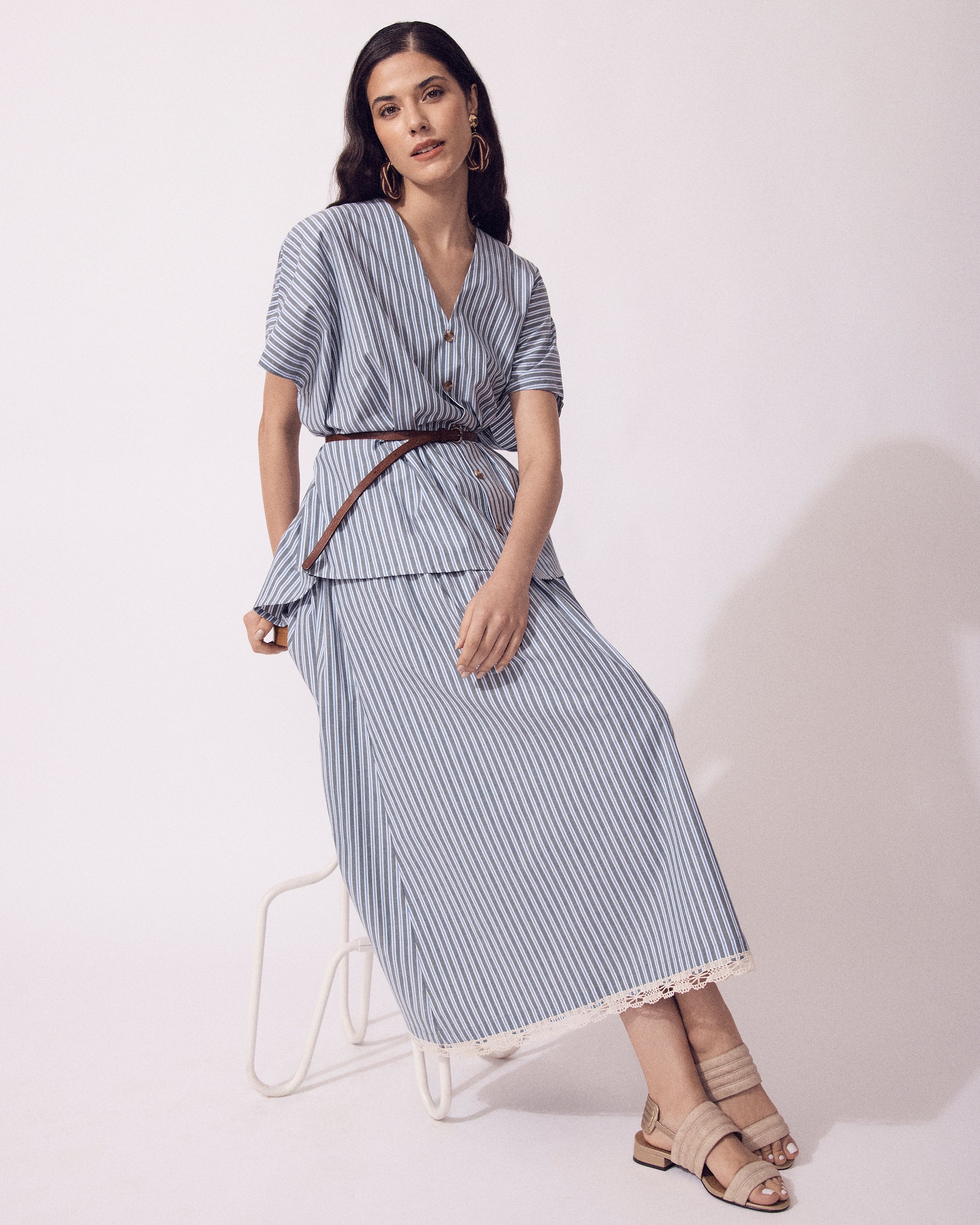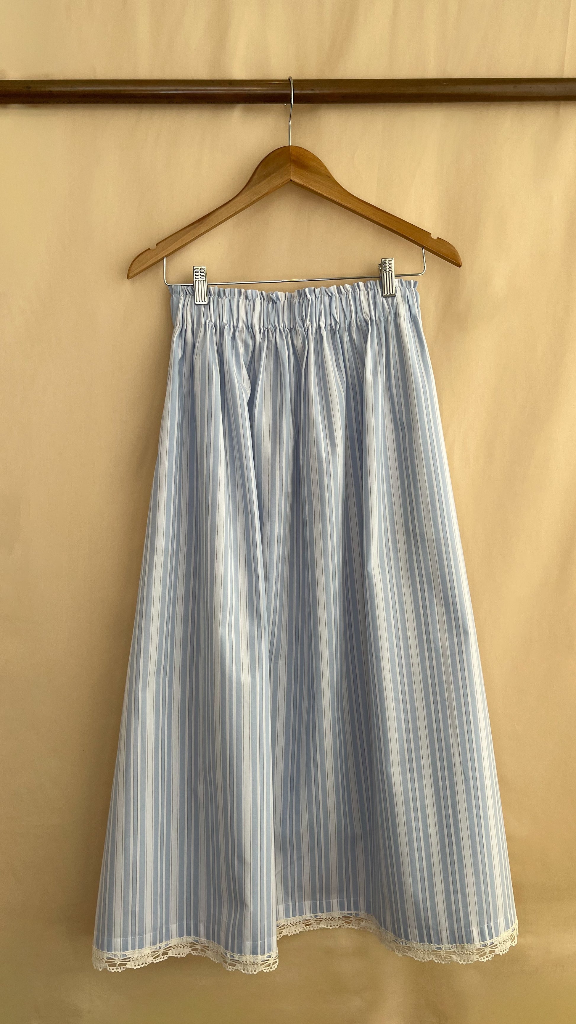 A Saia Levante é confeccionada em tecido de algodão listrado, disponível em duas versões. Com modelagem ampla e comprimento midi, o detalhe em renda guipir na barra garante um charme extra ao look. O cós com elástico traz conforto e se ajusta bem ao corpo.