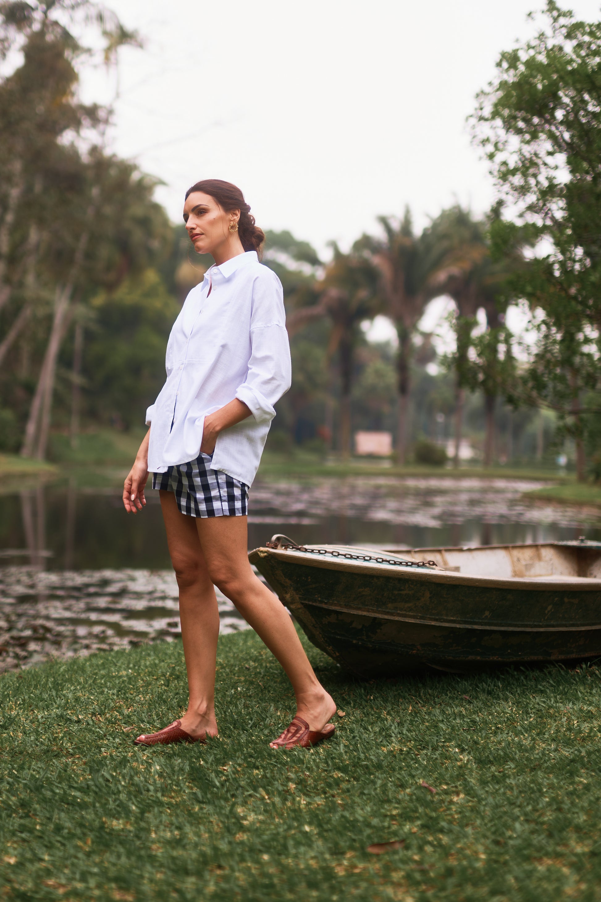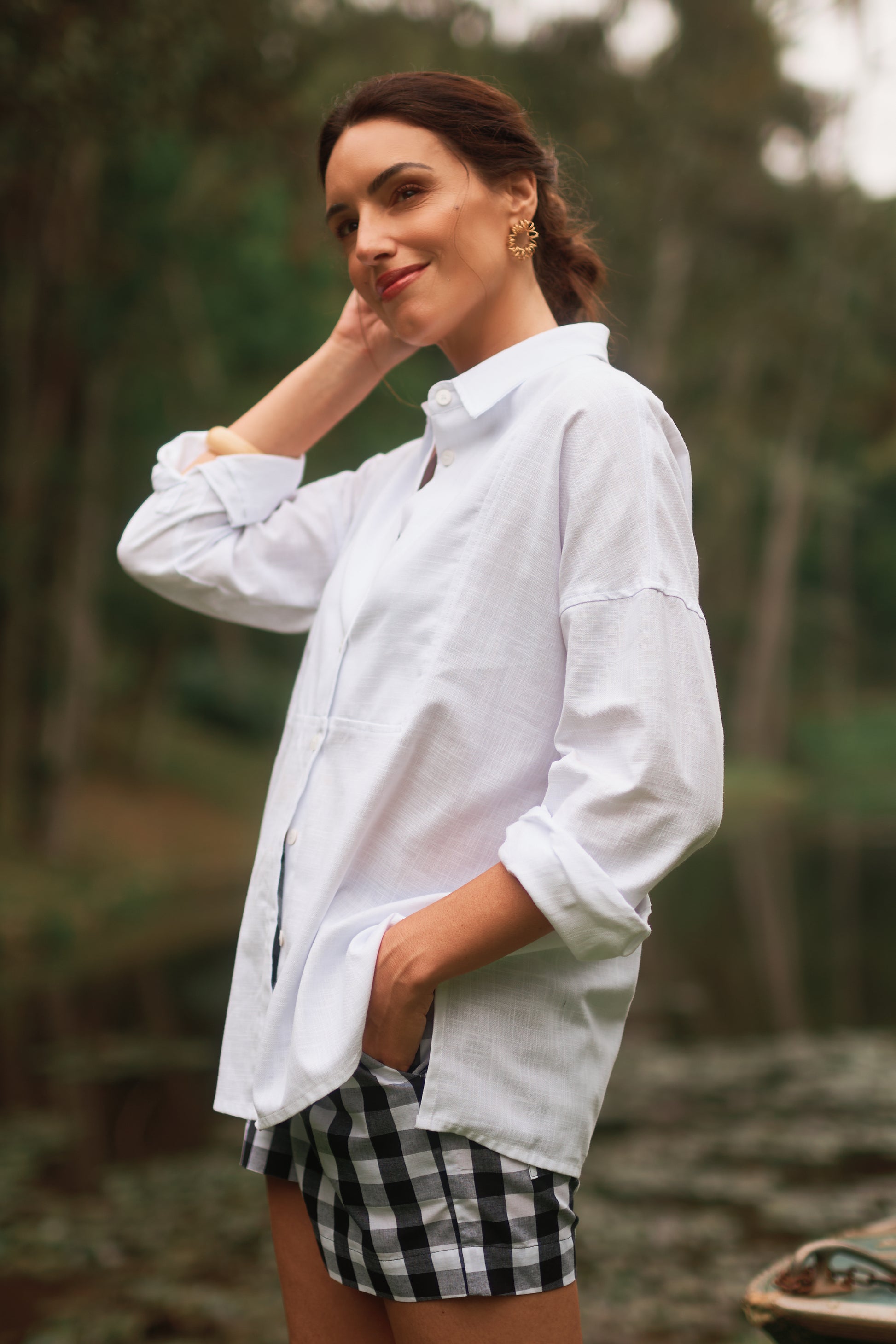O Shorts Grazia foi produzido com tecido vichy preto e branco de algodão. Possui bolsos laterais e traseiros e 2 botões forrados com o proprio tecido.