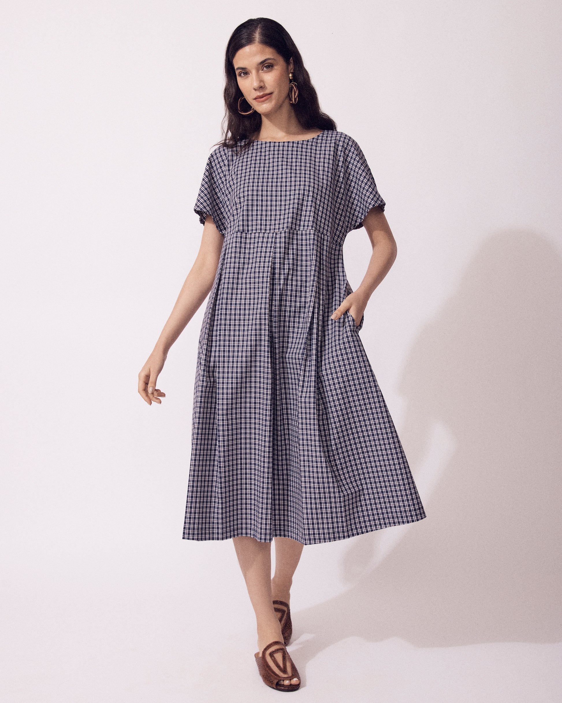 O Vestido Cris é confeccionado em algodão com estampa xadrez delicada. A modelagem é ampla, com mangas curtas, recorte abaixo do busto, bolsos laterais e pregas na saia que garantem caimento leve e fluido.