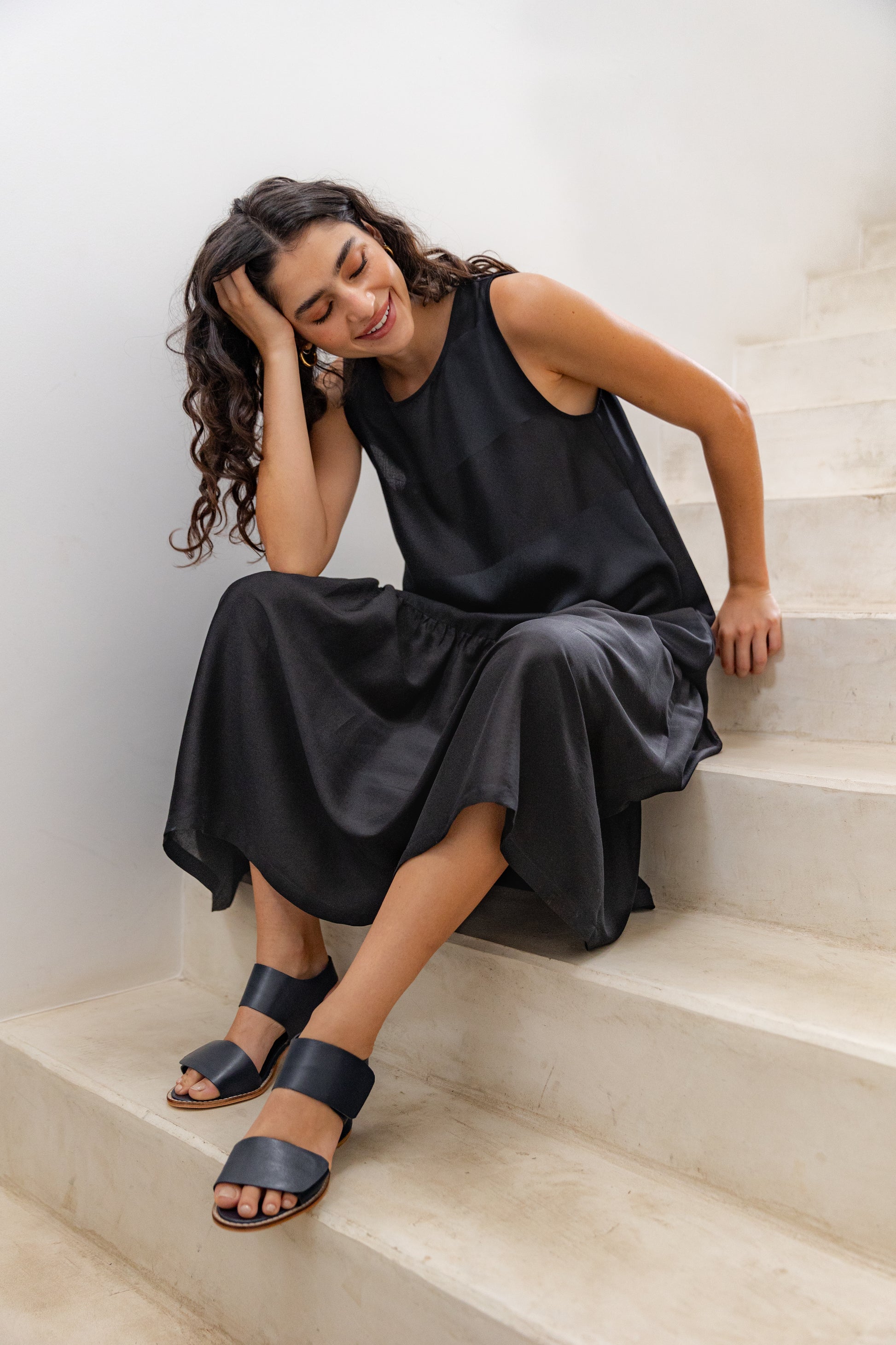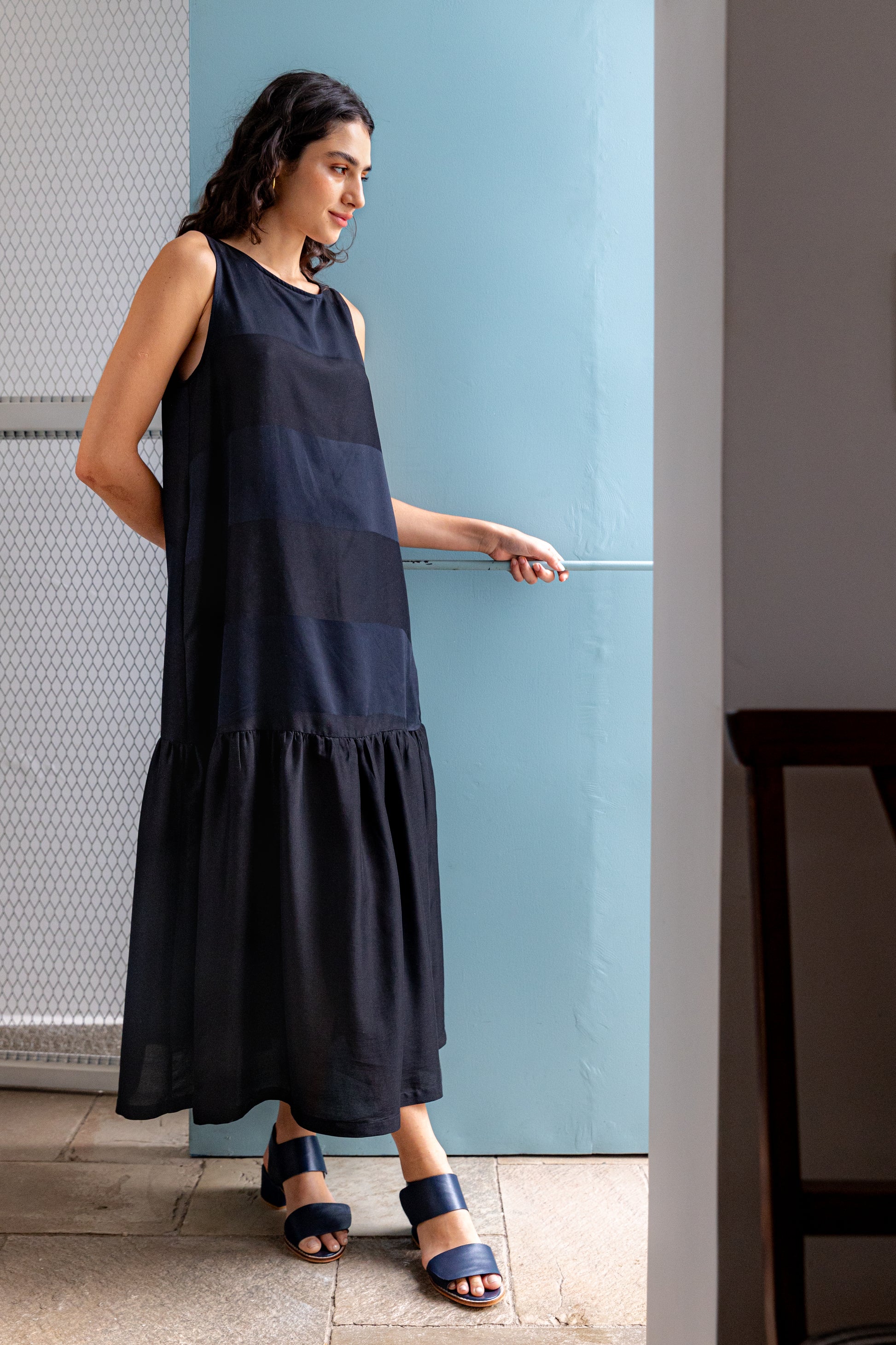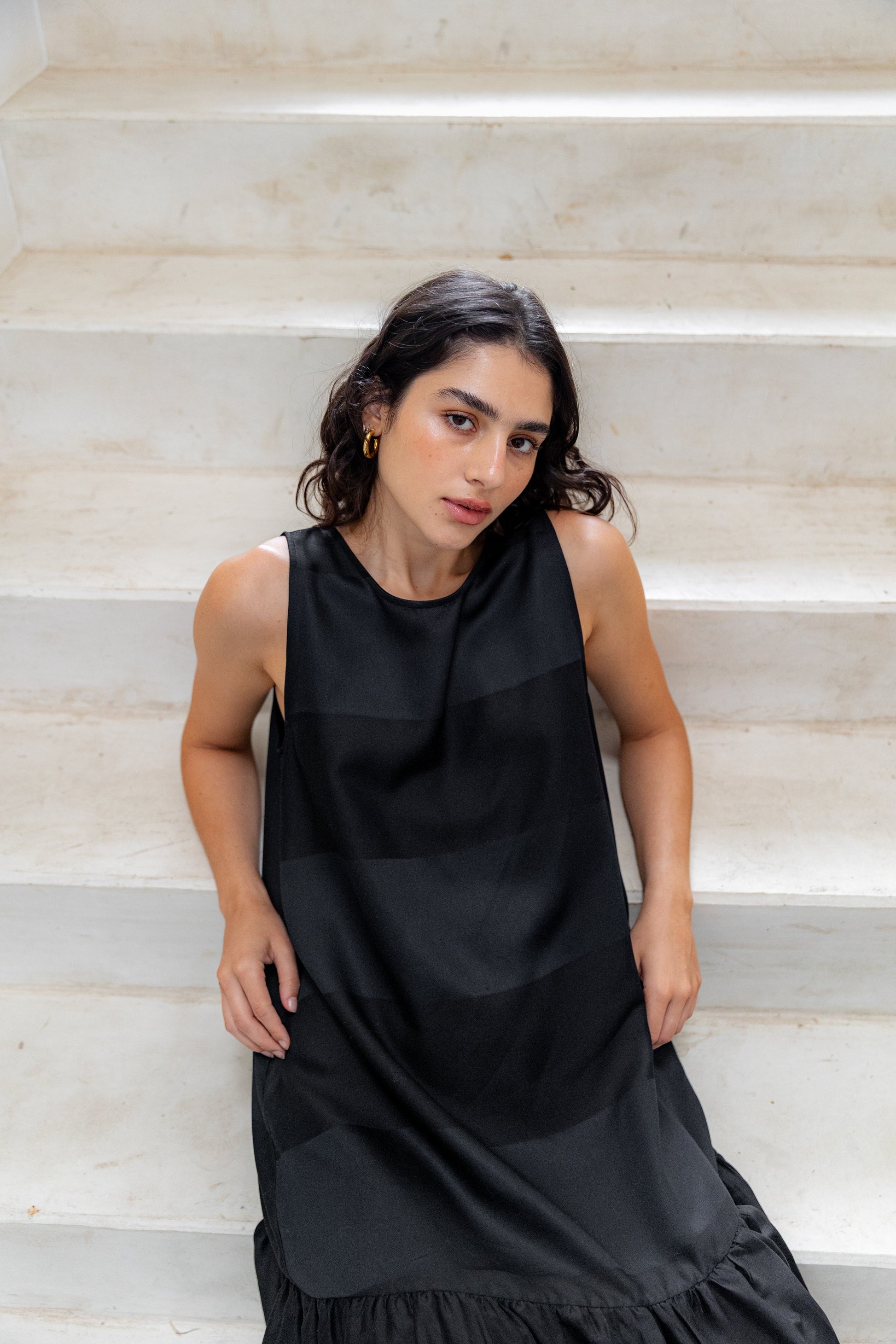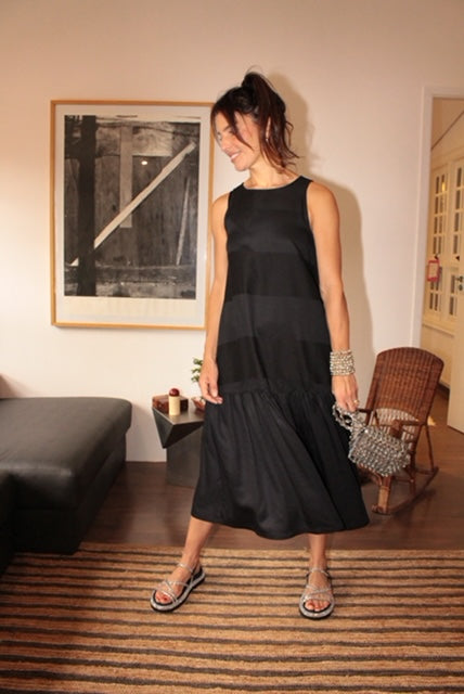 O Vestido Dama exala sofisticação com seu design clean e corte impecável que valorizam a silhueta de forma sutil. Produzido com tecido listrado na parte superior e liso na parte inferior ,de alta qualidade. Ideal para dias mais quentes , proporciona leveza e frescor.Possui bolsos laterais.